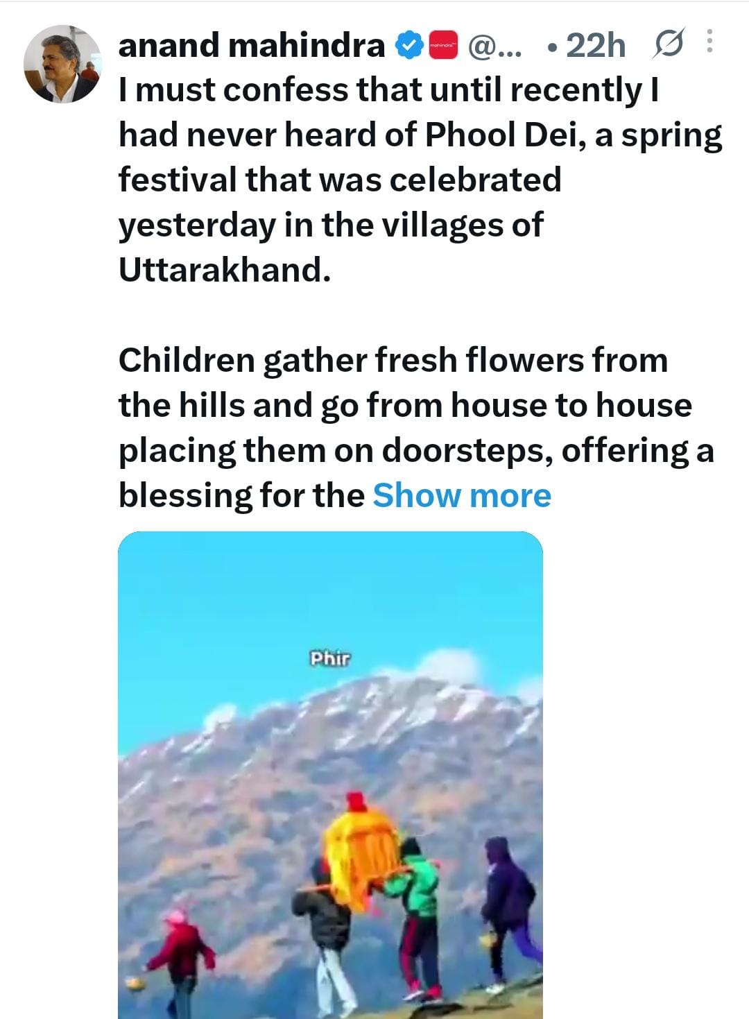 महिंद्रा ने लिखा कि हाल ही तक वे फूलदेई के बारे में नहीं जानते थे, लेकिन इस पर्व की परंपरा ने उन्हें गहराई से प्रभावित किया। उन्होंने बताया कि उत्तराखंड के गांवों में बच्चे पहाड़ों से ताजे फूल लाकर घर-घर के दरवाजों पर रखते हैं और समृद्धि की कामना करते हैं—“फूल देई, छम्मा देई, देनी द्वार, भर भकार…”। बदले में बच्चों को मिठाइयां मिलती हैं।