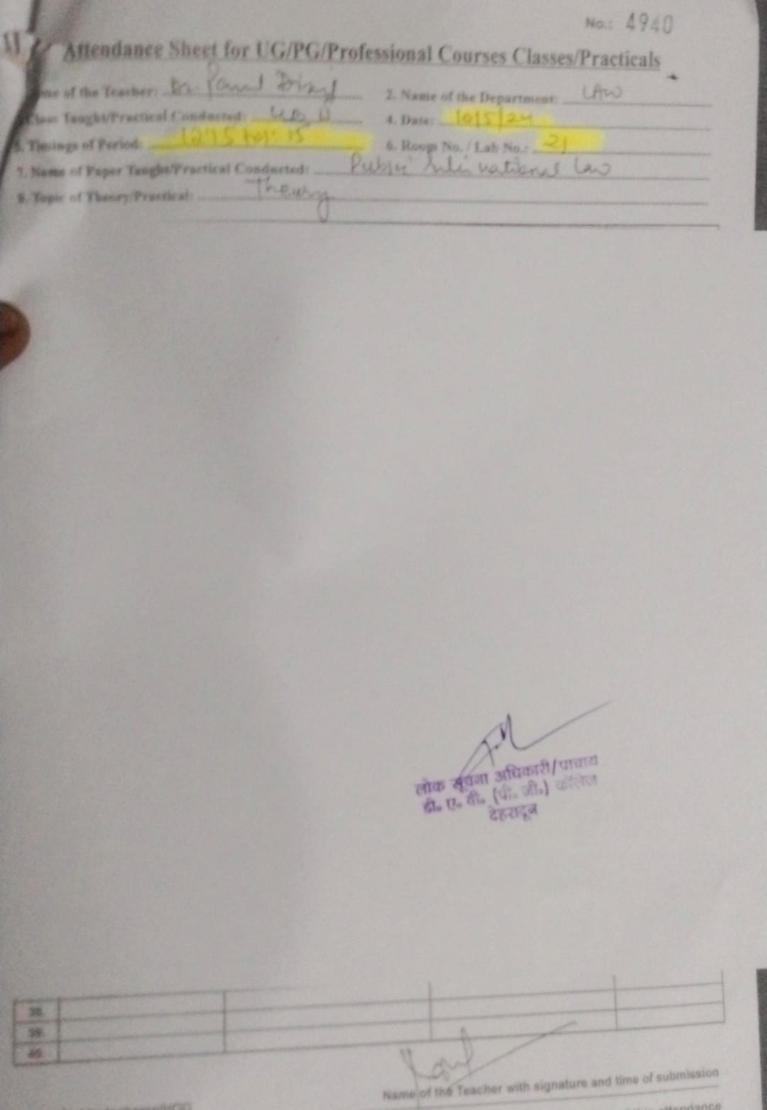 एक रजिस्टर में ‘पब्लिक इंटरनेशनल लॉ’ की कक्षा कमरा नंबर 21 में दर्ज है, जबकि दूसरी शीट में उसी समय ‘थ्योरी एंड प्रैक्टिकल’ पब्लिक इंटरनेशनल लॉ’ की क्लास 20 न कक्ष में दिखाई गई है।