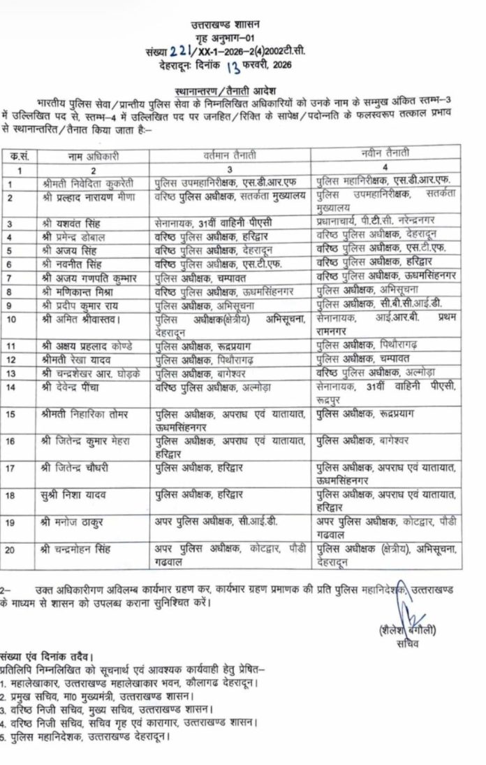 सरकार ने इस प्रशासनिक निर्णय के तहत कुल 20 पुलिस अधिकारियों के कार्यक्षेत्र में बदलाव किया है। माना जा रहा है कि यह कदम प्रदेश में कानून व्यवस्था को और मजबूत बनाने तथा हालिया आपराधिक घटनाओं पर प्रभावी नियंत्रण के उद्देश्य से उठाया गया है।
