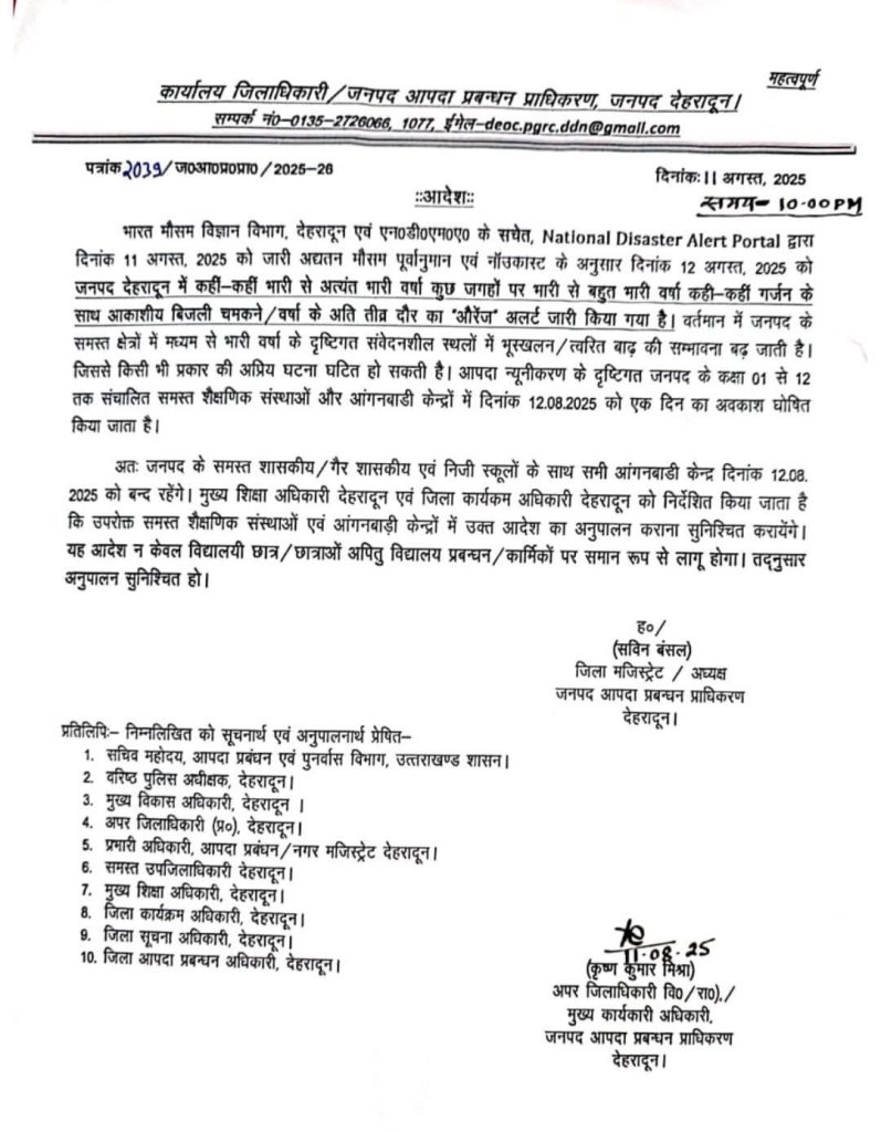 भारतीय मौसम विज्ञान विभाग (IMD) देहरादून और राष्ट्रीय आपदा प्रबंधन प्राधिकरण (NDMA) द्वारा जारी ताज़ा मौसम पूर्वानुमान के अनुसार, 12 अगस्त 2025 को देहरादून जनपद में भारी से अत्यंत भारी बारिश होने की संभावना है। इसको देखते हुए जिला प्रशासन ने स्कूल बंद करने का आदेश जारी किया है।