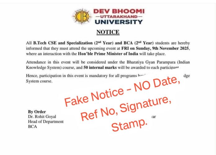 सोशल मीडिया पर देवभूमि उत्तराखंड यूनिवर्सिटी के नाम से जारी एक कथित नोटिस तेजी से वायरल हो रहा था, जिसमें दावा किया गया कि 09 नवंबर 2025 को एफआरआई में प्रधानमंत्री नरेंद्र मोदी के कार्यक्रम में छात्रों की उपस्थिति अनिवार्य है। इतना ही नहीं, उपस्थित होने पर 50 आंतरिक अंक (इंटरनल मार्क्स) दिए जाने और इसे भारतीय ज्ञान परंपरा (IKS) कोर्स से जोड़ने का दावा भी किया गया था।