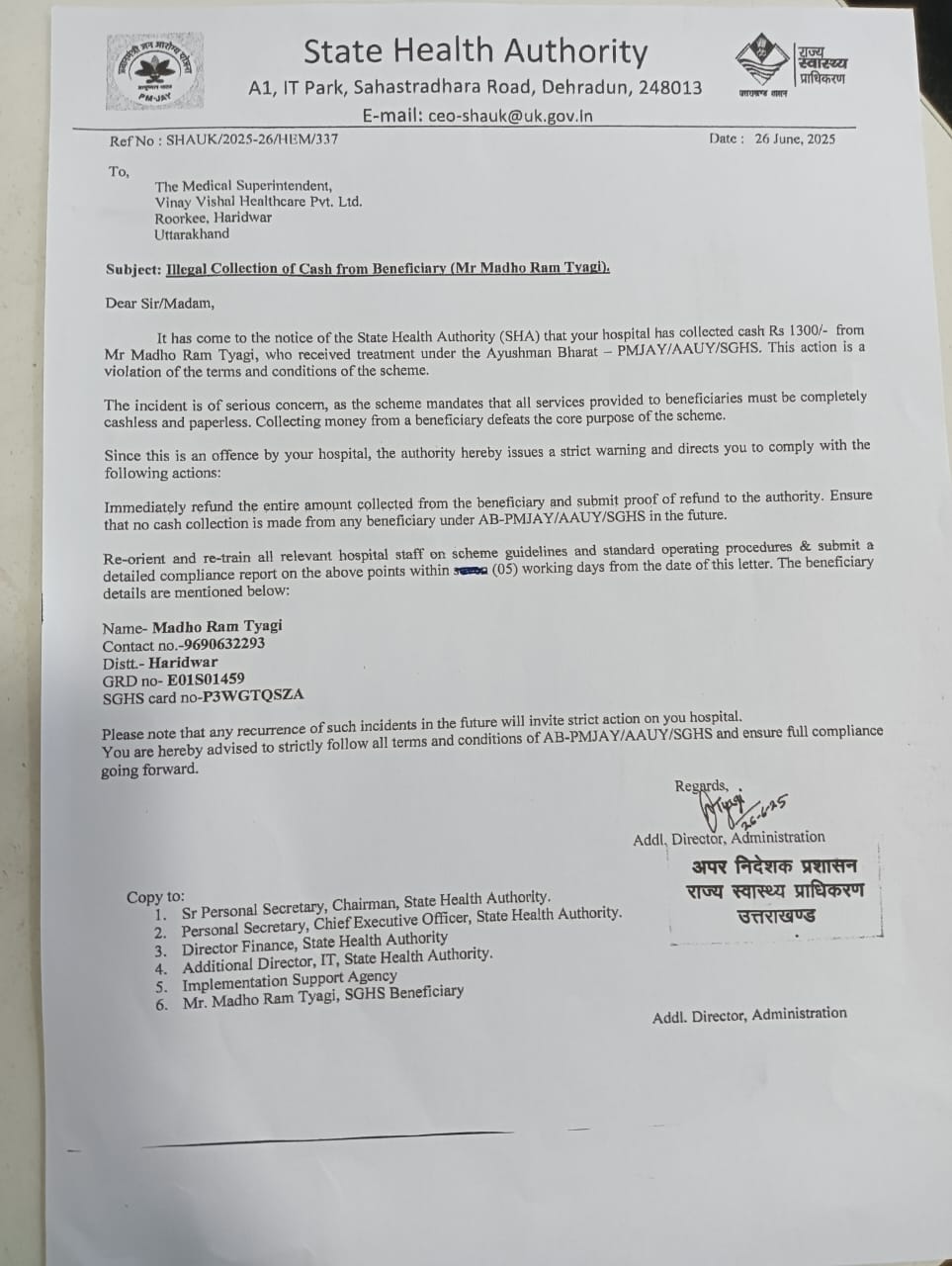 इसी क्रम में हरिद्वार निवासी माधौराम त्यागी ने राज्य स्वास्थ्य प्राधिकरण के टोल फ्री नंबर का उपयोग करते हुए में कॉल सेंटर में शिकायत की कि, विनय हॉस्पिटल हेल्थकेयर प्रा.लि. रूड़की हरिद्वार में उपचार के एवज में उनसे धनराशि ली गई है।
