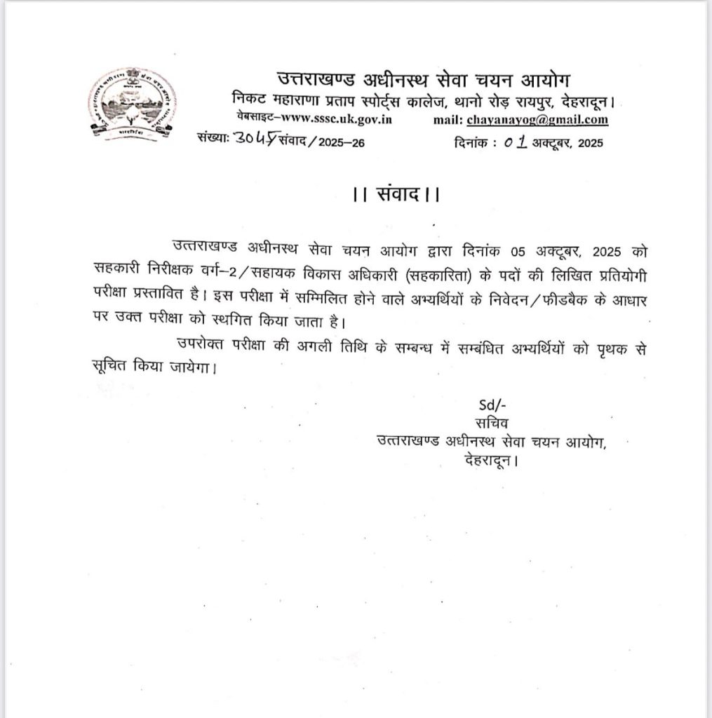 देहरादून। उत्तराखण्ड अधीनस्थ सेवा चयन आयोग (UKSSSC) ने बुधवार देर शाम अचानक 5 अक्टूबर को प्रस्तावित स्नातक स्तरीय परीक्षा को स्थगित कर दिया। आयोग ने इसका कारण तैयारियों को और पुख्ता करना और अभ्यर्थियों की मांग बताया है।