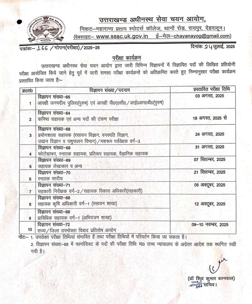 देहरादून, 24 जुलाई 2025 – उत्तराखण्ड अधीनस्थ सेवा चयन आयोग (UKSSSC) ने विभिन्न विज्ञापनों के अंतर्गत सरकारी पदों पर भर्ती के लिए लिखित प्रतियोगी परीक्षाओं की नई तिथियों की घोषणा कर दी है। आयोग द्वारा पूर्व में जारी सभी परीक्षा कार्यक्रमों को निरस्त करते हुए यह संशोधित कार्यक्रम लागू किया गया है।