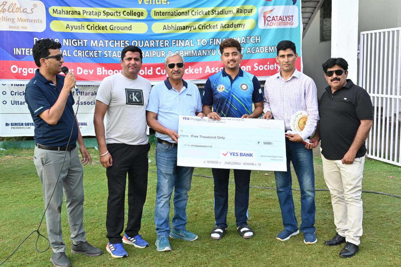 इस शानदार प्रदर्शन के लिए मयंक रावत को “प्लेयर ऑफ द मैच” चुना गया। उन्हें 5,000 रुपये का नकद पुरस्कार हरिद्वार क्रिकेट एसोसिएशन के सचिव इंद्रमोहन बड़थ्वाल और अनिल जोशी द्वारा प्रदान किया गया। इस मौके पर अनिल जोशी मुख्य अतिथि के रूप में उपस्थित थे।