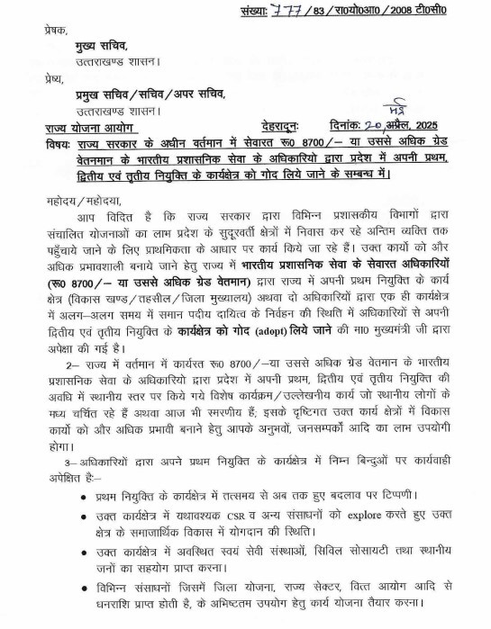 मुख्यमंत्री धामी का मानना है कि गांवों का चतुर्दिक विकास ही विकसित उत्तराखंड और विकसित भारत की दिशा में सबसे मजबूत आधार है। इसी सोच के साथ उन्होंने ग्रेड-पे ₹8700 या इससे अधिक वाले आईएएस अधिकारियों से अपील की थी कि वे अपने प्रथम नियुक्ति स्थलों को गोद लें और वहां समर्पित विकास कार्य सुनिश्चित करें।
