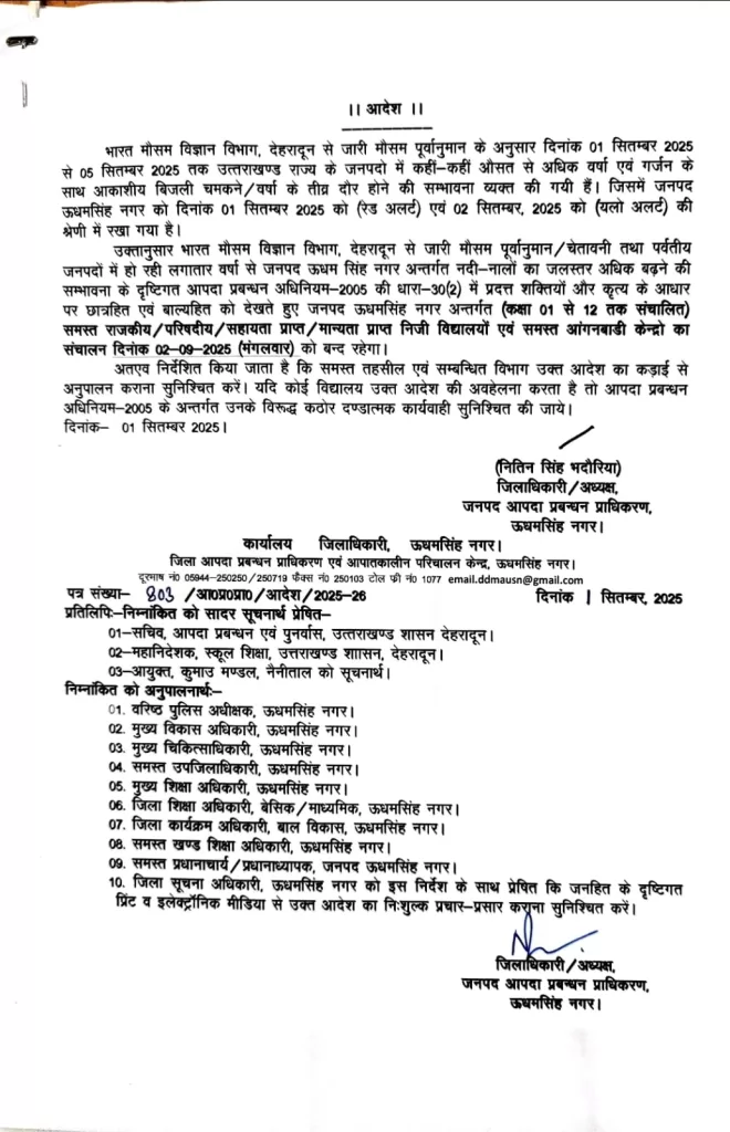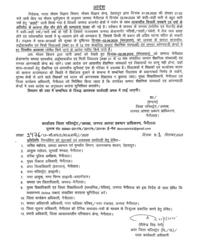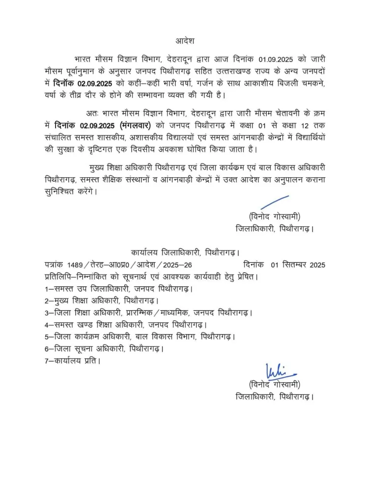 मौसम विभाग की चेतावनी और बच्चों की सुरक्षा को देखते हुए प्रशासन ने 2 सितंबर को पिथौरागढ़(Pithoragarh School Closed), चंपावत(Champawat school closed), चमोली(Chamoli School closed), रुद्रप्रयाग(Rudraprayag school closed), उधम सिंह नगर (Udham Singh Nagar school closed), अल्मोड़ा (Almora School closed), नैनीताल (Nanital School closed)और उत्तरकाशी(uttarkashi school closed) जिले में सभी सरकारी, निजी और गैर-सरकारी स्कूलों (कक्षा 1 से 12 तक) को बंद रखने का आदेश दिया है। इसके साथ ही आंगनबाड़ी केंद्रों में भी अवकाश घोषित किया गया है।